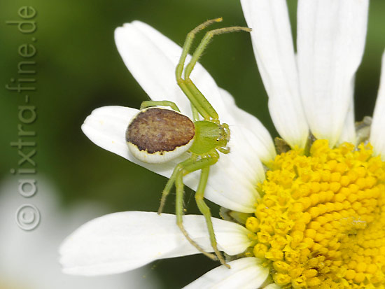 Diaea dorsata - grüne oder auch grünbraune krabbenspinne genannt die weibchen werden 5 - 6 mm, die männchen 3 - 4 mm groß. damit gehören sie zu den kleineren krabbenspinnenarten.