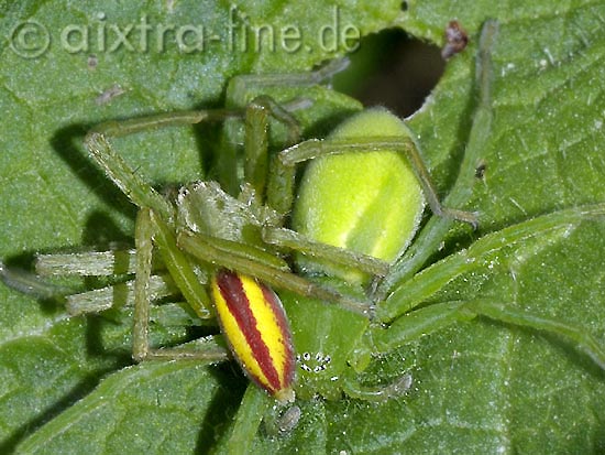 Micrommata virescens - grüne huschspinne - gehört zur familie der riesenkrabbenspinnen (sparassidae) und ist ihr einziger heimischer vertreter. wesentlich zahlreicher sind die riesenkrabbenspinnen in den tropen vertreten. die spinnen sind wärme- und sonnenliebend, tagaktiv, sehr flinke jäger und ihr biss ist für menschen schmerzhaft, aber ohne folgen. |