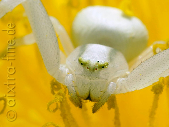 Misumena vatia - veränderliche krabbenspinne - portrait hier ist eine weiß gefärbte krabbenspinne auf einer löwenzahnblüte unterwegs