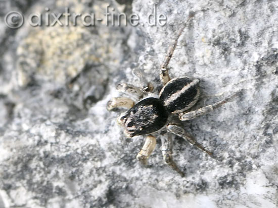 Aelurillus v-insignitus - männchen die männchen erreichen eine körpergröße von 4 - 5 mm, die weibchen werden mit 5 - 7 mm etwas größer und sind unauffälliger gezeichnet.