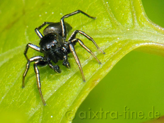 Heliophanus sp. - vermutlich auch cupreus - männchen seine pedipalpen sind im gegensatz zu denen der weibchen dunkel, aber wie seine beine mit weißen streifen versehen.