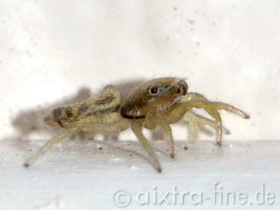Marpissa muscosa - rindenspringspinne - winziges jungtier ein ca. 2 mm kleiner laufender punkt an der balkontür - unser neues haustier