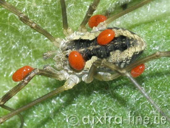 dieser, mir leider unbekannte, weberknecht wird von milben parasitiert.