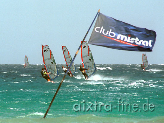 so schööön kann surfen sein - kleine segel, kleine bretter, wind ohne ende (das sogar 10 tage lang) und eine kleine welle schwappt auch noch herum. von diesen tagen träumt man! übrigens: das braune auf der fahne ist sand, den der wind dorthin verfrachtet hat - tolle werbung |