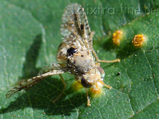 Noeeta pupillata die fliegenmännchen verteidigen ihr revier auf der wirtsplanze, mit heftigem flügelschwenken gegen rivalen.