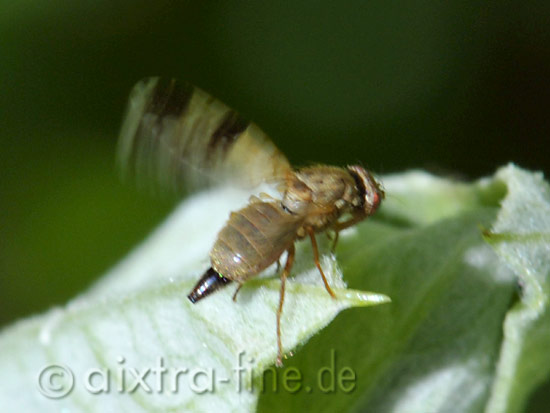 Tephritis cf. bardanae ♀ klettenbohrfliege die kleinen fliegen finden sich auf ihren wirtsplanzen und fallen dort oftmals durch ihr flügelschwingen auf.