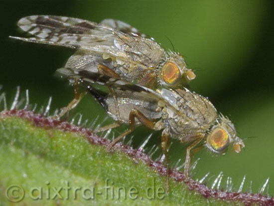 Tephritis cf. divisa - kopula ursprünglich heimisch in südeuropa, die larven entwickeln sich in den blütenköpfen von bitter- und habichtskräutern (besonders picris echioides).