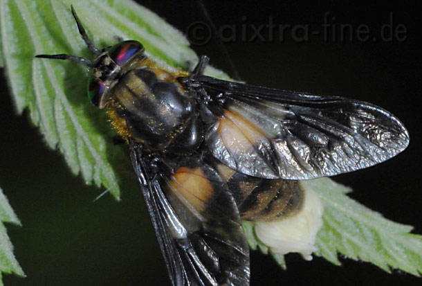 diese bremsenart wird 8.5 - 10 mm groß und fliegt in der zeit von mai bis september. sie hat transparente flügel mit markanten dunklen flächen. auf ihrem 2. rückensegment befindet sich eine auffällige zeichnung in der form eines umgedrehten V.