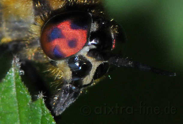 die augen sind auffällig bunt mit dunkleren flecken versehen. die erwachsenen tiere ernähren sich von nektar und pollen, dazu saugen die weibchen auch noch das blut großer säugetiere,