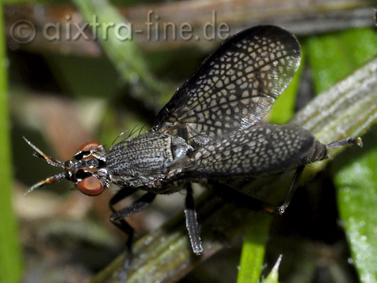 Coremacera marginata - melierte schneckenfliege die eiablage des weibchens erfolgt in der nähe von schnecken. die larven ernähren sich dann parasitisch von diesen. ihnen "schmecken" sowohl nackt-, wie auch gehäuseschnecken.
