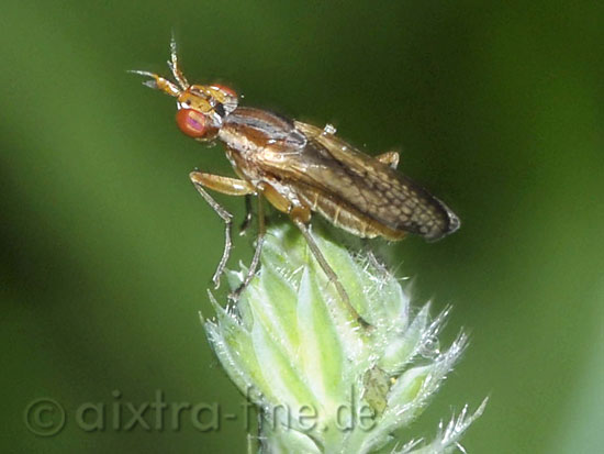 Limnia unguicornis - gelbstirnige streckhornfliege im 2. und 3. larvenstadium überfallen sie lebende schnecken. im englischen heißen die hornfliegen "snail-killing fly".