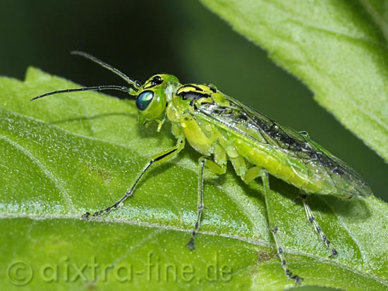 Rhogogaster cf. viridis die blattwespen haben eine körperlänge von 10 bis 13 mm. sie fliegen in den monaten mai bis juli.