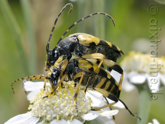 Leptura maculata - gefleckter schmalbock - paarung die ausgewachsenen käfer fressen blütenpollen, die larven fressen totholz
