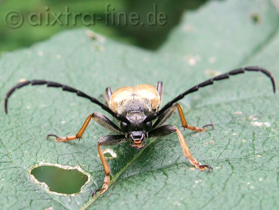 Corymbia rubra (Stictoleptura rubra) - rothalsbock - männchen die männchen sind kleiner als die weibchen und unterscheiden sich farblich. männchen mit schwarzem kopf und halsschild, die flügeldecken sind braungelb