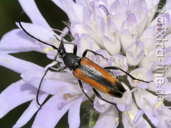 Stenurella melanura - schwarzschwänziger schmalbock - weibchen männchen: flügeldecken braun, naht, seitenrand und spitze geschwärzt weibchen: flügeldecken rotbraun, naht und spitze stärker geschwärzt