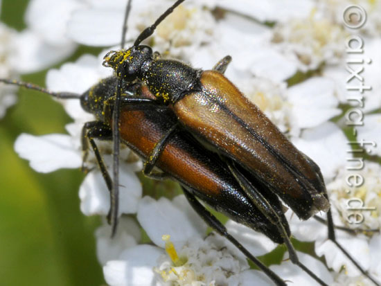 Stenurella melanura - schwarzschwänziger schmalbock - paarung männchen: flügeldecken braun, naht, seitenrand und spitze geschwärzt weibchen: flügeldecken rotbraun, naht und spitze stärker geschwärzt