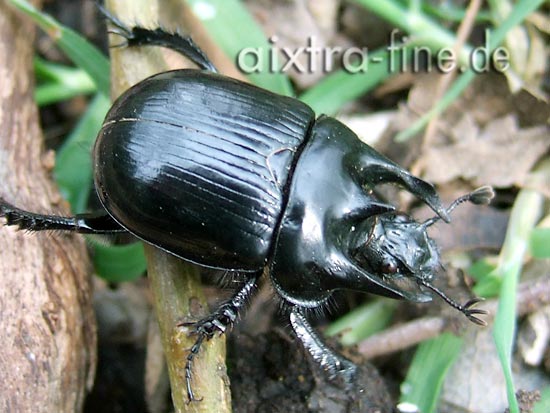 stierkäfer - Typhaeus typhoeus männchen sein halsschild weist 3 stark ausgebildete hörner auf, beim weibchen sind die hörner nur angedeutet