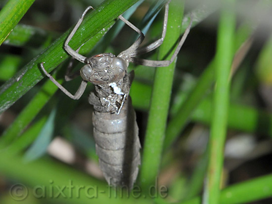 hier sieht man die verlassene larvenhülle mit dem "ausstieg". die entwicklung der libellen dauert etwa 1 - 2 jahre. ist die larve ausgewachsen, kriecht sie an einer pflanze aus dem wasser heraus. an dem pflanzenstängel hängend schlüpft die ausgewachsene libelle aus ihrer larvenhaut.