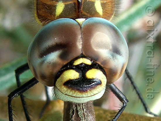 mann trägt "bart"! libellen können ausgesprochen gut sehen. ihre großen facettenaugen sind aus unzählig vielen (bis zu 28000) winzigen einzelaugen zusammengesetzt. unterhalb der augen befinden sich ihre sehr kleinen fühler.