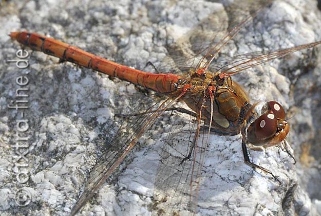 Sympetrum cf. striolatum - große heidelibelle ♂ das erwachsene, ausgefärbte männliche tier ist rot mit zwei hellen streifen seitlich am oberkörper. es hat eine körperlänge von 35 - 44 mm. seine flügel erreichen eine spannweite von 55 - 65 mm.