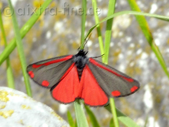 Tyria jacobaea - blutbär, jakobskrautbär hier zeigt er mal seine leuchtend roten hinterflügel. die falter sind vorwiegend nachtaktiv, lassen sich aber tagsüber leicht aufscheuchen.