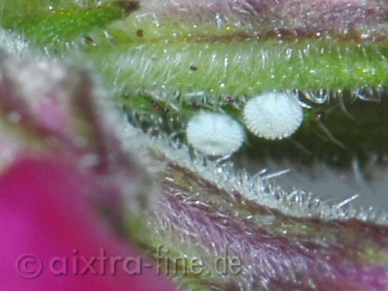 faulbaumbläuling - Celastrina argiolus hier liegen nun zwei eier zwischen den blüten der verbenen, die eier sind in etwa 0,6mm im durchmesser "groß" und haben eine wabenartige struktur.