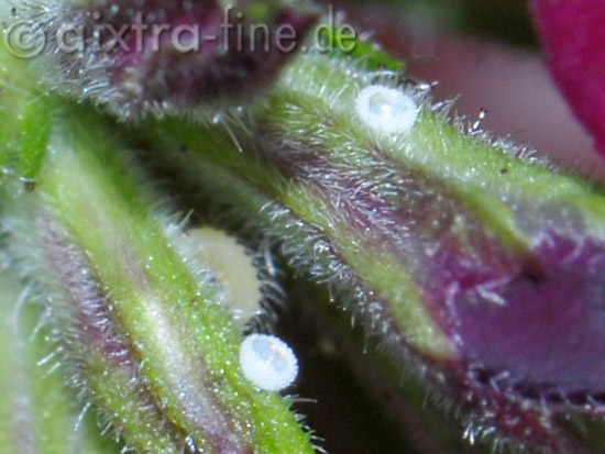 faulbaumbläuling - Celastrina argiolus hier zwei andere, gerade frisch verlassene eihüllen. im hintergrund sieht man noch, wie eine verdammt kleine, grünliche raupe im "dickicht" verschwindet.