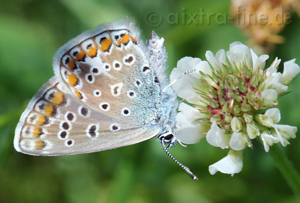 hauhechel-bläuling - Polyommatus icarus ♀ die weibchen haben meist eine braune flügeloberseite, die aber auch farbig schillern kann, mit orangen flecken am rand. manchmal fällt ihre färbung aber auch sehr blau aus.