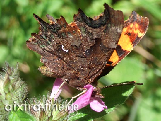 Polygonia c-album (Nymphalis c-album) - c-falter trägt seinen namen wegen dieses kleinen weißen c-förmigen flecks auf der flügelunterseite. er wird auch comma genannt.