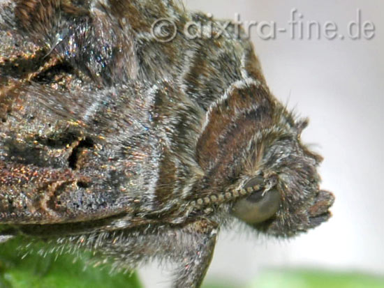 Autographa gamma - gammaeule (portrait) sie ist während der gesamten wärmeren jahreszeit von mai bis oktober zu beobachten. die falter bringen mehrere generationen pro jahr hervor.