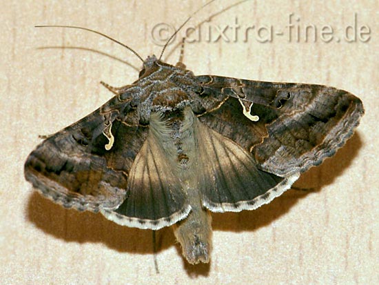 ihre vorderflügel sind in der grundfärbung variabel von hell graubraun bis rötlich braun. schwarzbraune bis rötlichbraune muster befinden sich auf der oberseite und in der mitte ist jeweils ein silbrigweißer gammaförmiger makel. ihre hinterflügel sind gelbbraun mit einem dunklen und breiten außensaum.