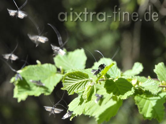 grüner langfühler - adela reaumurella syn. adela viridella - tanzen oftmals in großen schwärem. die männchen erkennt man an ihren sehr langen hellen fühlern, die fühler der weibchen sind deutlich kürzer. flügelspannweite: 14 - 18 mm |