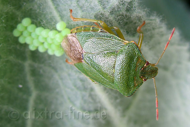 Palomena prasina - grüne stinkwanze eiablage hier legt gerade das weibchen seine eier unter dem blatt einer königskerze (verbascum) ab. am nächsten tag haben wir genau 28 stück gezählt, was wohl der anzahl im größtmöglichen gelege entspricht.