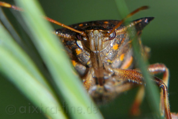 Picromerus bidens - zweizähnige dornwanze, zweispitzwanze der räuber im gras, vorne kann man unterhalb des kopfes den langen angelegten saugrüssel erkennen.