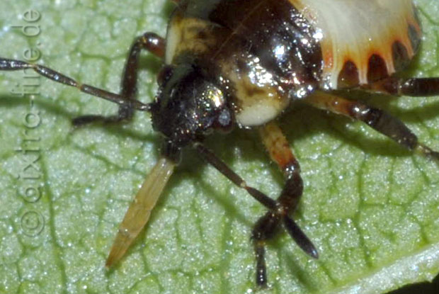 Troilus luridus - spitzbauchwanze larve hier sieht man gut den saugrüssel der larve. die larven der spitzbauchwanzen kann man zwischen juni und oktober beobachten, die adulten tiere überwintern und begründen im frühjahr eine neue generation.