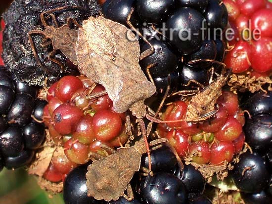 saumwanze, große randwanze - coreus marginatus - großfamilieerwachsenes tier und larven in div. stadien auf brombeeren