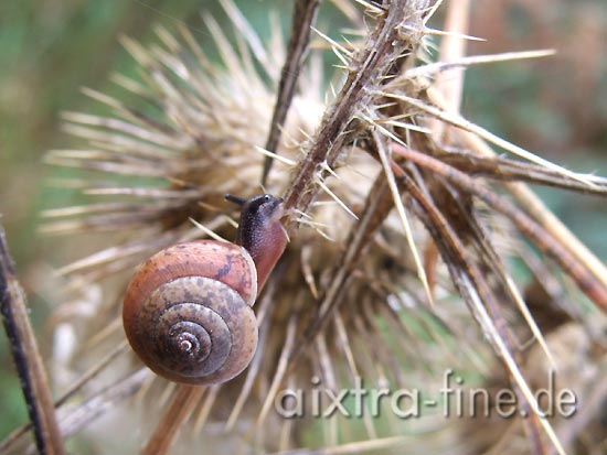 eine rötliche laubschnecke (perforatella incarnata) auf stacheligen pfaden