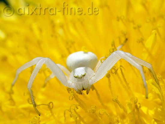 Misumena vatia - veränderliche krabbenspinne hier ist eine weiß gefärbte krabbenspinne auf einer löwenzahnblüte unterwegs