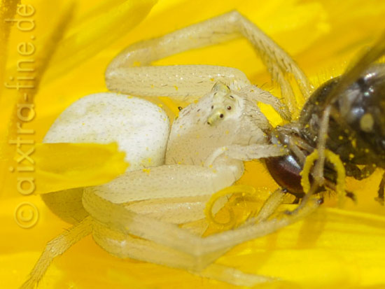 Misumena vatia - veränderliche krabbenspinne obwohl die tarnung auf der löwenzahnblüte nicht perfekt ist, war die spinne erfolgreich, sie hat eine schwebfliege erwischt.