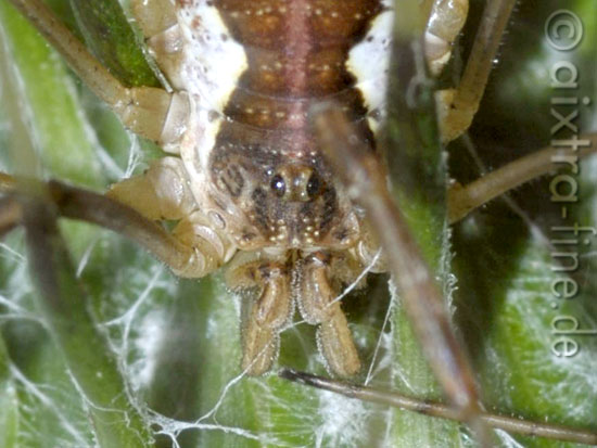 dieser weberknecht hat eine ausgesprochen schöne färbung. auf einem distelblütekopf lauert er auf beute.