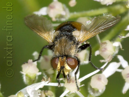 Gymnosoma sp. das ei wird auf einer wanze der familie der baumwanzen (Pentatomidae), abgelegt. die frisch geschlüpften larven dringen in den wirt ein, dort überwintert die larve auch.