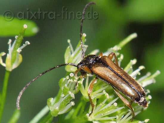 Alosterna tabacicolor - feldahorn-bock er wird auch "tabakfarbiger schmalbock" genannt. meist findet man ihn in wäldern.