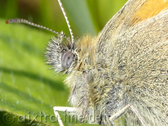 Coenonympha pamphilus - kleiner heufalter, kleines wiesenvögelchen die raupe des falters ist grün gefärbt mit längsstreifen und wird ca. 18 mm lang und hat 2 kleine "zipfel" am hinterleibsende. sie frißt div. grasarten und überwintert.