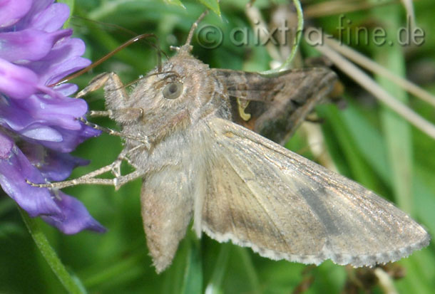 Autographa gamma - gammaeule die gammaeulen haben einen sehr langen rüssel mit dem sie auch den nektar aus tiefen blütenkelchen erreichen.