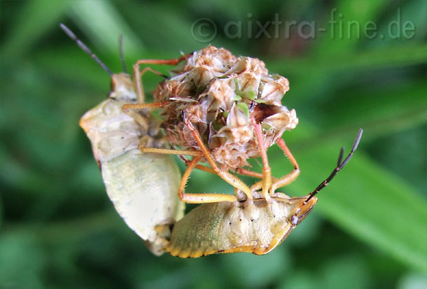 Carpocoris cf. purpureipennis - purpur-baumwanze hier ist eine "hochzeit" auf einem spitzwegerich-fruchtstand zugange.