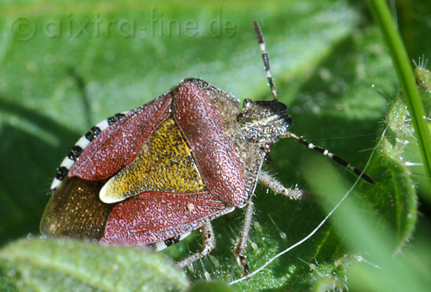 Dolycoris baccarum - beerenwanze eine mittelgroße baumwanze mit 10 - 12 mm körperlänge. sie ist rötlich gefärbt mit auffällig geringelten fühlern und gut sichtbarer behaarung.