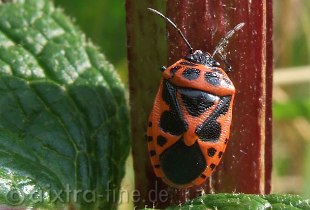 mit ihren 5,5 bis 7,5 mm ist sie wahrhaft zierlich. sie ist auffallend gemustert in kräftigem rot mit schwarzer zeichnung. daher wird sie auch als rotschwarze gemüsewanze bezeichnet.