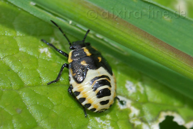 Eurydema oleraceum - kohlwanze die larven findet man frühestens von ende mai an bis juli, oder wie diese hier anfang august, ganz besonders häufig sieht man sie an knoblauchsrauken (Alliaria petiolata).