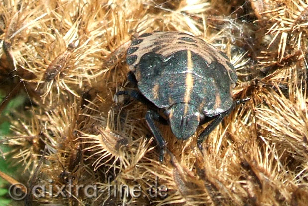Graphosoma lineatum - streifenwanze larve bei der larve zeigen sich zaghaft die ersten streifen, während die kräftig rote farbe noch komplett fehlt. diese bekommt die streifenwanze erst nach der letzten häutung.
